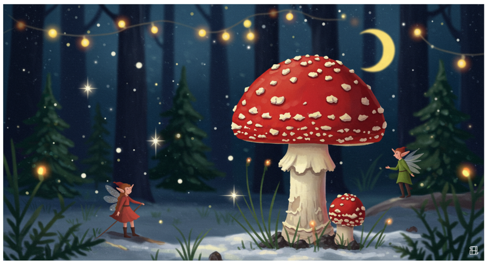 Der Fliegenpilz nimmt einen besonderen Platz in deutschen Weihnachtsbräuchen ein, insbesondere in der Advents- und Neujahrszeit. Weihnachtskarten mit Fliegenpilzdarstellungen unter einem Sternenhimmel oder neben einer Mondsichel sind ein beliebtes Motiv in der deutschen Bildkultur. Diese Tradition könnte ihre Wurzeln in nord- und mitteleuropäischen Winterritualen und magischen Vorstellungen haben.